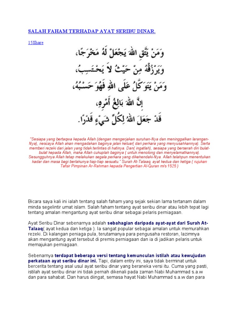 Ayat seribu Dinar dan Surat At Thalaq. Bacaan Doa Ayat Seribu Dinar. Ayat seribu dinar ini sebenarnya adalah kandungan surat At Thalaq ayat 2 dan 3 yang dimana.